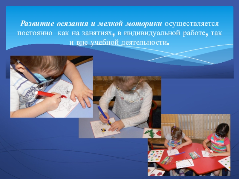 Слайд 13Развитие осязания и мелкой моторики осуществляется постоянно как на занятиях, в