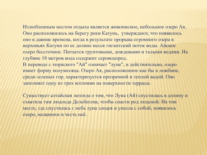 Слайд 21Излюбленным местом отдыха является живописное, небольшое озеро Ая. Оно расположилось на берегу