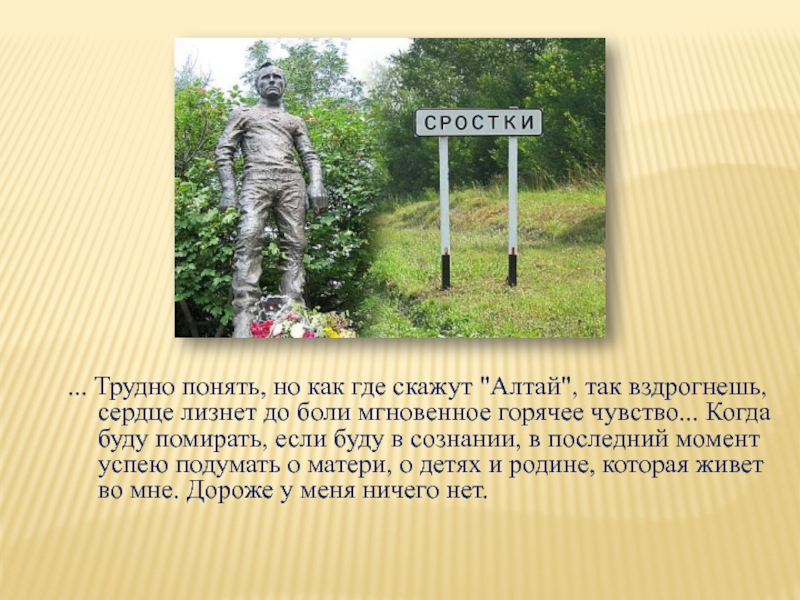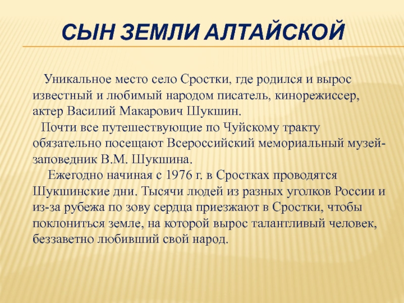 Слайд 6Нельзя постичь до конца творческую природу Шукшина, не побывав в Сростках,