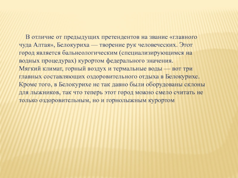 Алтая», Белокуриха — творение рук человеческих. Этот город является бальнеологическим (специализирующимся на водных процедурах) курортом федерального значения.