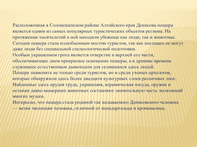 Интересно, что пещера стала родиной так называемого Денисовского человека — ветви эволюции человека, отличной от неандертальца и кроманьонца.