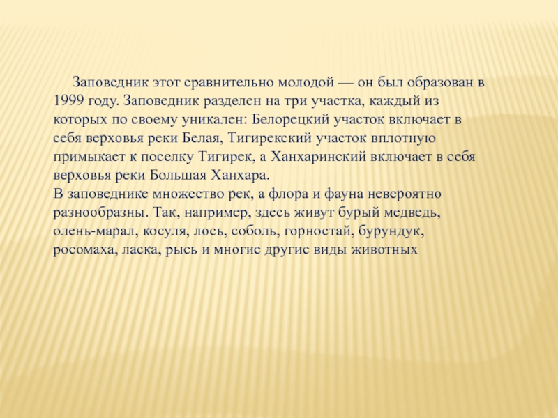 в 1999 году. Заповедник разделен на три участка, каждый из которых по своему уникален: Белорецкий участок включает в себя верховья реки Белая, Тигирекский участок вплотную примыкает к поселку Тигирек, а Ханхаринский включает в себя верховья реки Большая Ханхара.