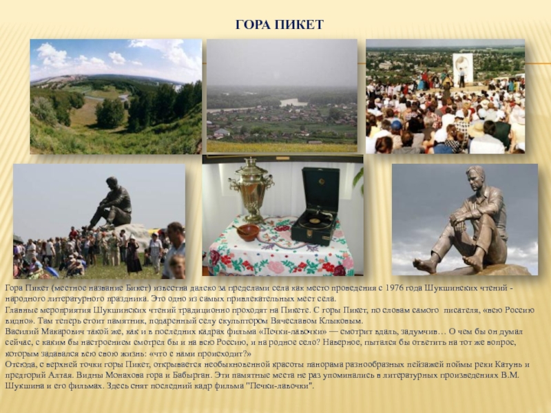 Главные мероприятия Шукшинских чтений традиционно проходят на Пикете. С горы Пикет, по словам самого писателя, «всю Россию видно». Там теперь стоит памятник, подаренный селу скульптором Вячеславом Клыковым.