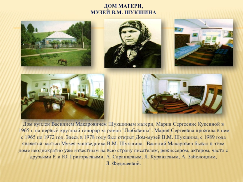 в 1965 г. на первый крупный гонорар за роман "Любавины". Мария Сергеевна прожила в нем с 1965 по 1972 год. Здесь в 1978 году был открыт Дом-музей В.М. Шукшина, с 1989 года является частью Музея-заповедника В.М. Шукшина. Василий Макарович бывал в этом доме неоднократно уже известным на всю страну писателем, режиссером, актером, часто с друзьями Р. и Ю. Григорьевыми, А. Саранцевым, Л. Куравлевым, А. Заболоцким, Л. Федосеевой.