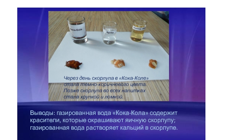 Через день скорлупа в «Кока-Коле» стала темно-коричневого цвета. Позже скорлупа во всех напитках стала хрупкой и ломкой.