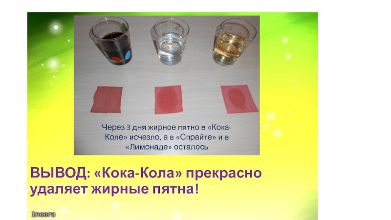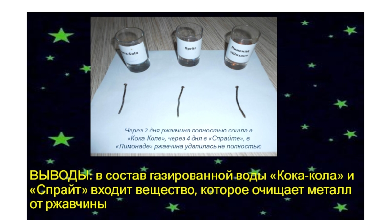 Через 2 дня ржавчина полностью сошла в «Кока-Коле», через 4 дня в «Спрайте», в «Лимонаде» ржавчина удалилась не полностью