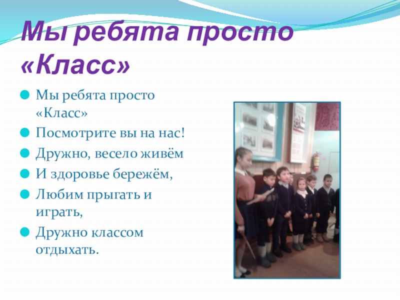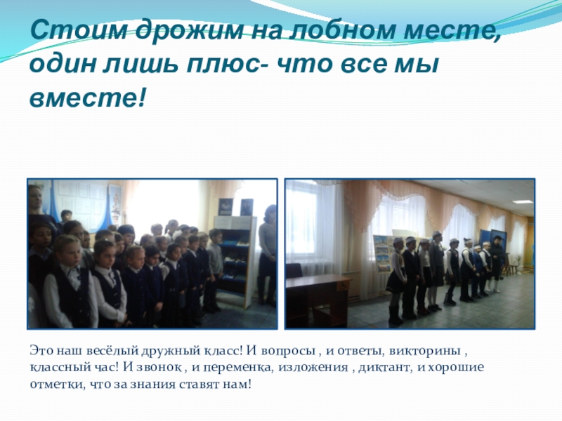 Это наш весёлый дружный класс! И вопросы , и ответы, викторины , классный час! И звонок , и переменка, изложения , диктант, и хорошие отметки, что за знания ставят нам!