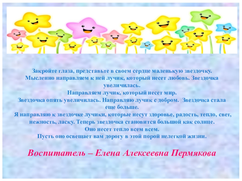 Закройте глаза, представьте в своем сердце маленькую звездочку. Мысленно направляем к ней лучик, который несет любовь. Звездочка увеличилась.