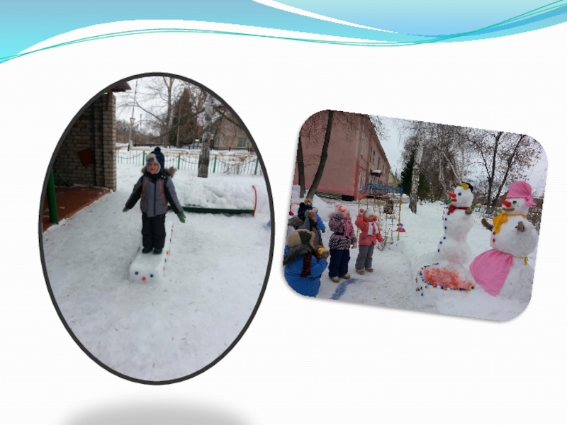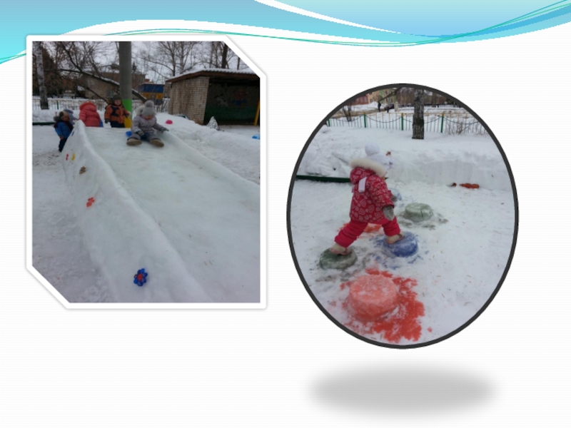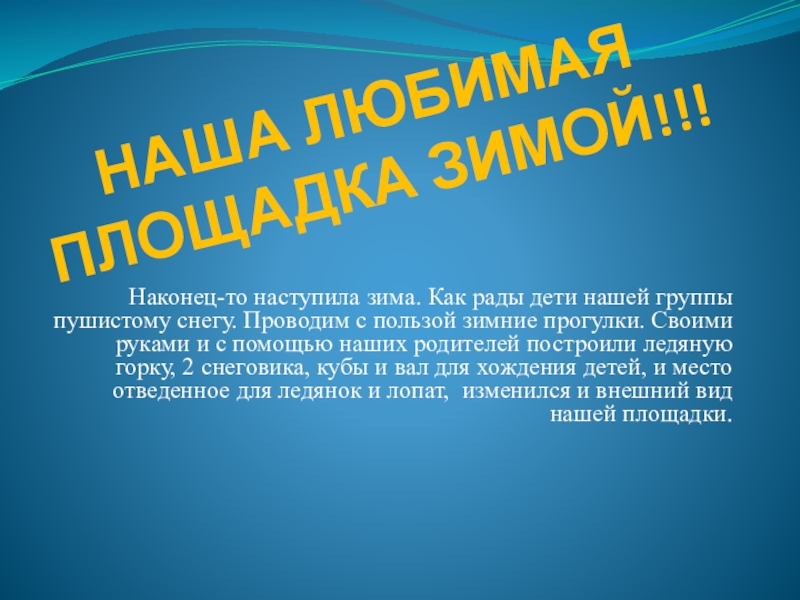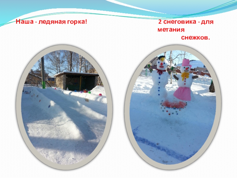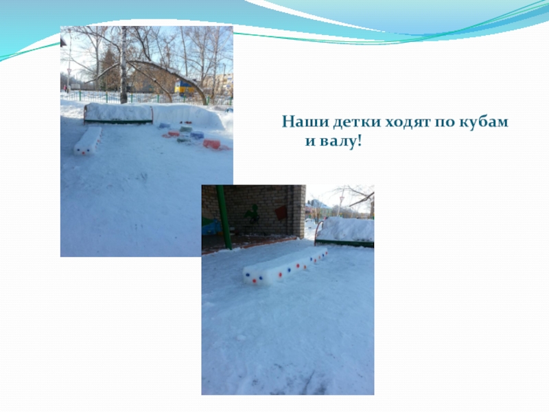 пушистому снегу. Проводим с пользой зимние прогулки. Своими руками и с помощью наших родителей построили ледяную горку, 2 снеговика, кубы и вал для хождения детей, и место отведенное для ледянок и лопат, изменился и внешний вид нашей площадки.