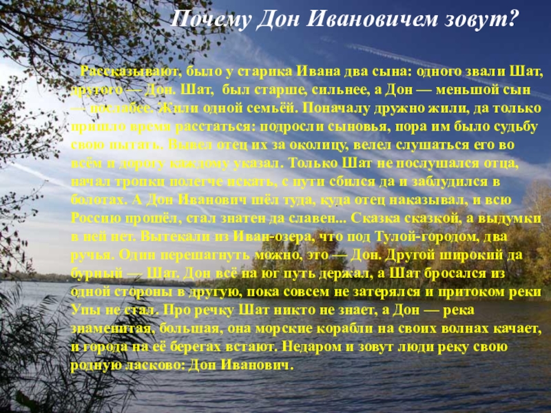 сына: одного звали Шат, другого — Дон. Шат, был старше, сильнее, а Дон — меньшой сын — послабее. Жили одной семьёй. Поначалу дружно жили, да только пришло время расстаться: подросли сыновья, пора им было судьбу свою пытать. Вывел отец их за околицу, велел слушаться его во всём и дорогу каждому указал. Только Шат не послушался отца, начал тропки полегче искать, с пути сбился да и заблудился в болотах. А Дон Иванович шёл туда, куда отец наказывал, и всю Россию прошёл, стал знатен да славен... Сказка сказкой, а выдумки в ней нет. Вытекали из Иван-озера, что под Тулой-городом, два ручья. Один перешагнуть можно, это — Дон. Другой широкий да бурный — Шат. Дон всё на юг путь держал, а Шат бросался из одной стороны в другую, пока совсем не затерялся и притоком реки Упы не стал. Про речку Шат никто не знает, а Дон — река знаменитая, большая, она морские корабли на своих волнах качает, и города на её берегах встают. Недаром и зовут люди реку свою родную ласково: Дон Иванович.