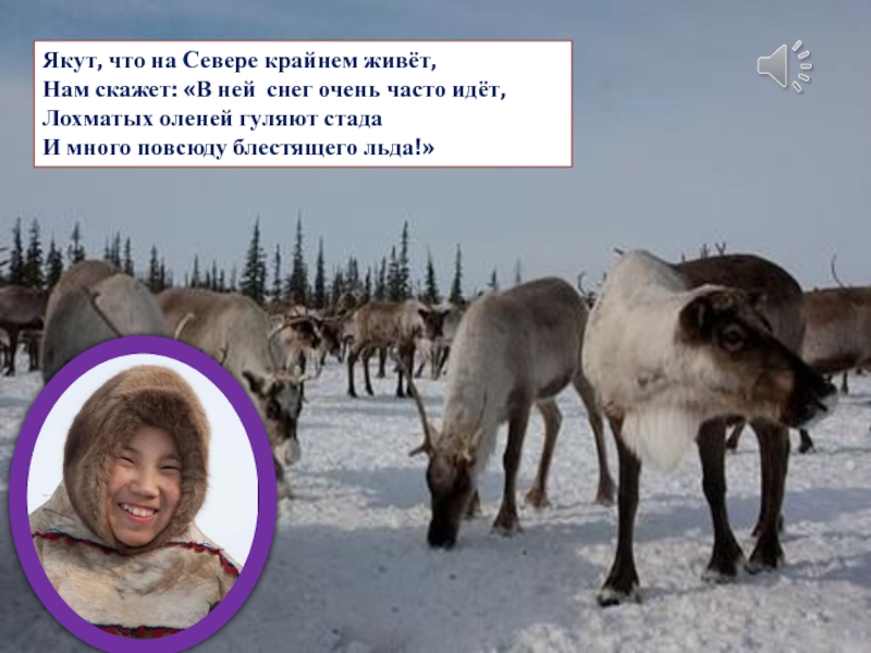 Якут, что на Севере крайнем живёт,Нам скажет: «В ней снег очень часто идёт,Лохматых оленей гуляют стадаИ много