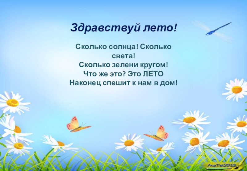 Здравствуй лето!Сколько солнца! Сколько света!Сколько зелени кругом!Что же это? Это ЛЕТОНаконец спешит к нам в дом!