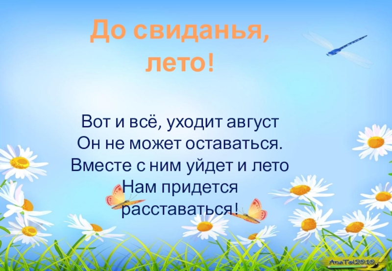 До свиданья, лето!Вот и всё, уходит августОн не может оставаться.Вместе с ним уйдет и летоНам придется расставаться!