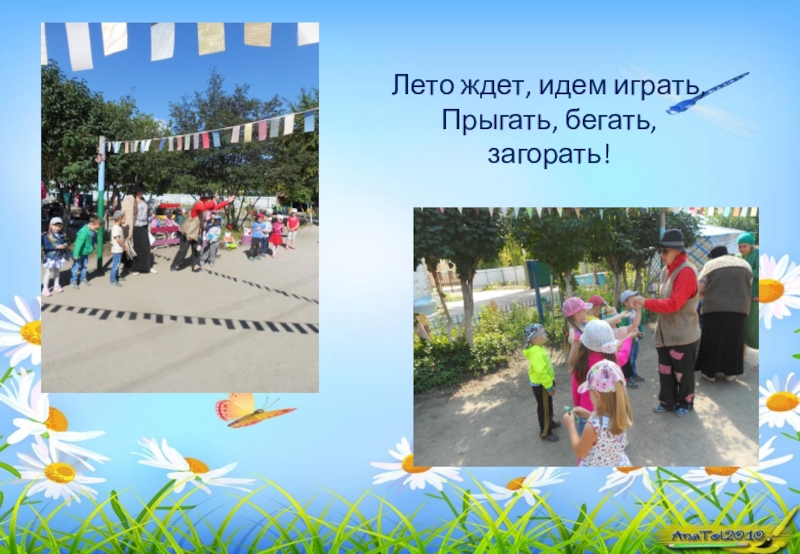 Лето ждет, идем играть,Прыгать, бегать, загорать!