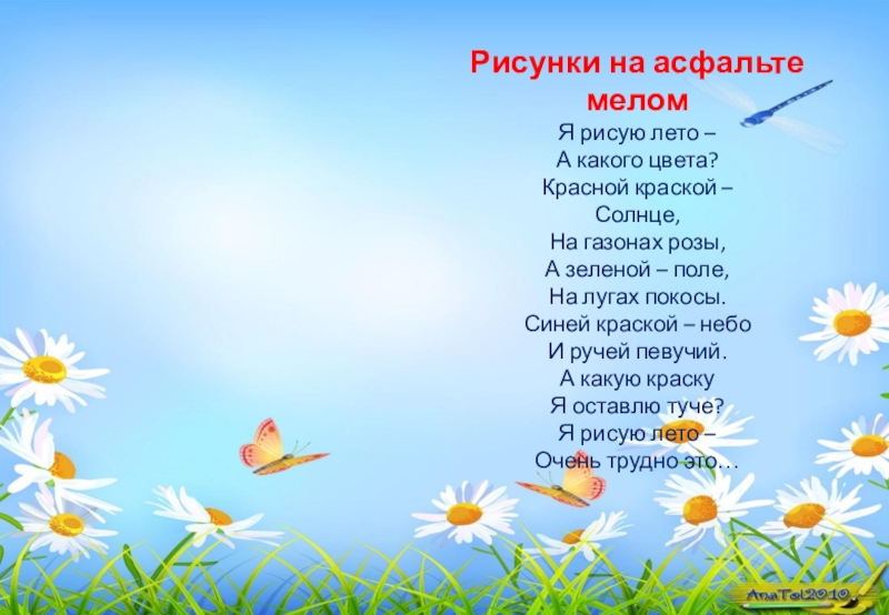 Рисунки на асфальте меломЯ рисую лето – А какого цвета?Красной краской – Солнце,На газонах розы,А зеленой –