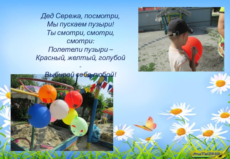 Дед Сережа, посмотри,Мы пускаем пузыри!Ты смотри, смотри, смотри:Полетели пузыри –Красный, желтый, голубой - Выбирай себе любой!