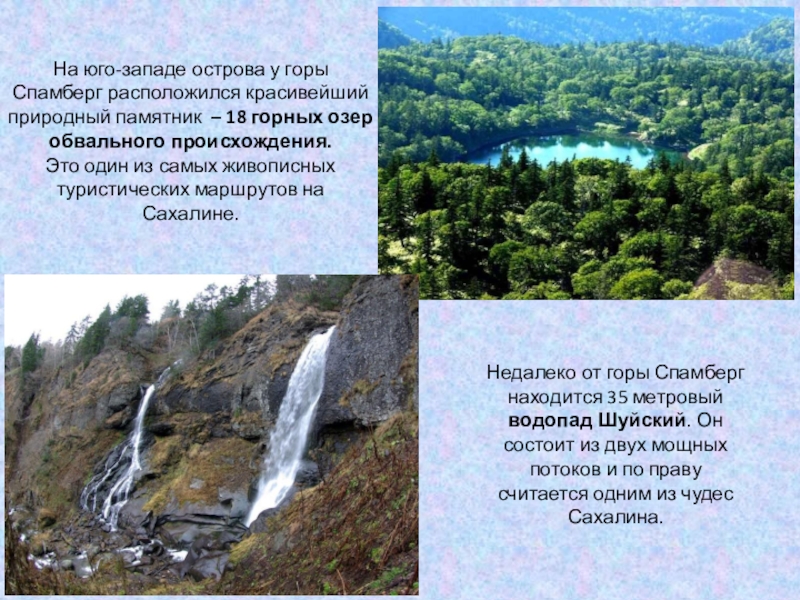 Недалеко от горы Спамберг находится 35 метровый водопад Шуйский. Он состоит из двух мощных потоков и по праву считается одним из чудес Сахалина.