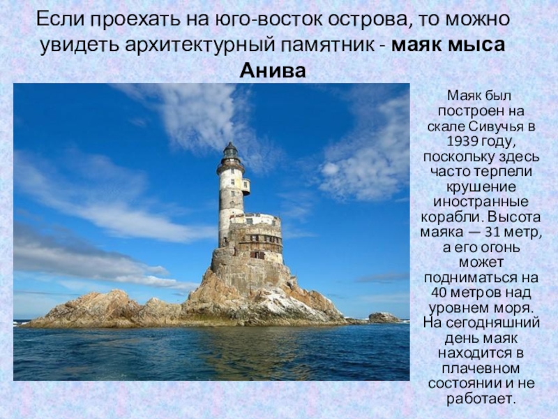 Маяк был построен на скале Сивучья в 1939 году, поскольку здесь часто терпели крушение иностранные корабли. Высота маяка — 31 метр, а его огонь может подниматься на 40 метров над уровнем моря. На сегодняшний день маяк находится в плачевном состоянии и не работает.