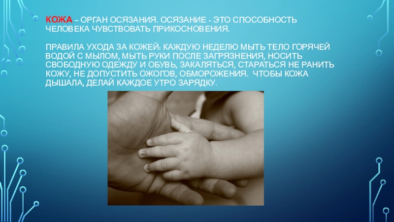 Кожа – орган осязания. Осязание - это способность человека чувствовать прикосновения.   Правила ухода за кожей: