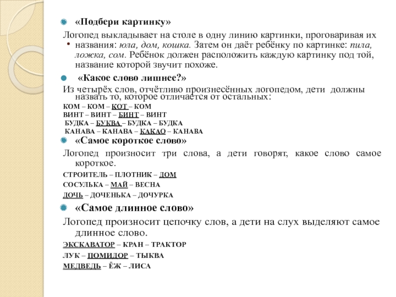 Логопед произносит цепочку слов, а дети на слух выделяют самое длинное слово.