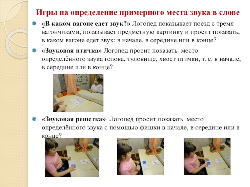звук?» Логопед показывает поезд с тремя вагончиками, показывает предметную картинку и просит показать, в каком вагоне едет звук: в начале, в середине или в конце?