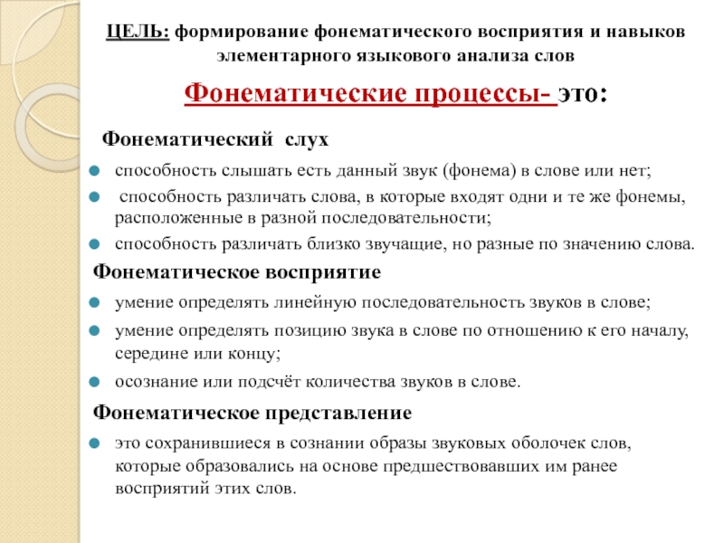 Слайд 2ЦЕЛЬ: формирование фонематического восприятия и навыков элементарного языкового анализа слов