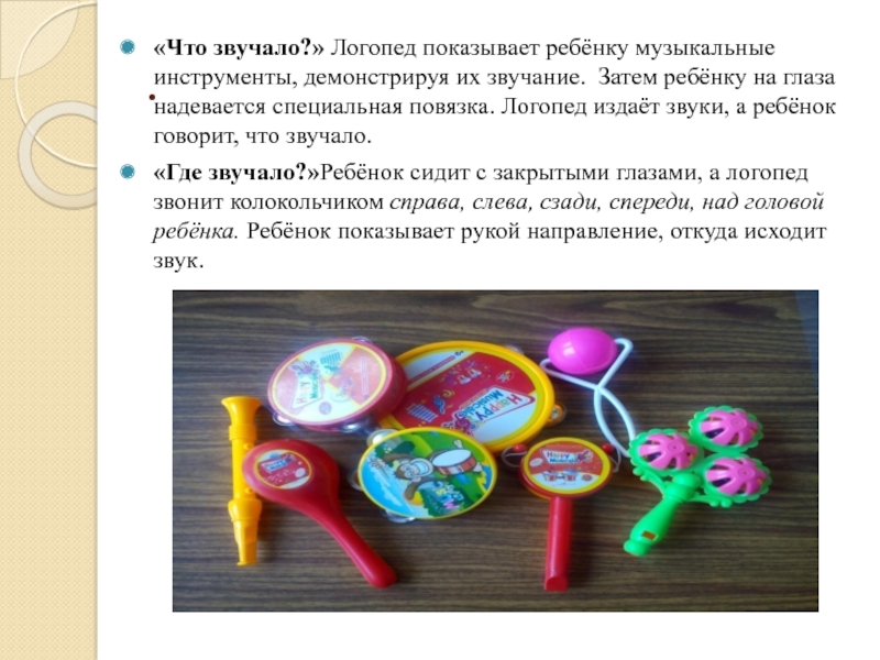 «Что звучало?» Логопед показывает ребёнку музыкальные инструменты, демонстрируя их звучание. Затем