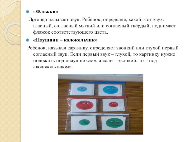 Если ребёнок услышит правильное название того, что изображено на картинке, то он должен поднять зелёный флажок, а если неправильное – красный.