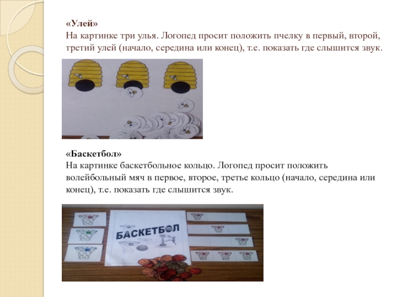 На картинке баскетбольное кольцо. Логопед просит положить волейбольный мяч в первое, второе, третье кольцо (начало, середина или конец), т.е. показать где слышится звук.