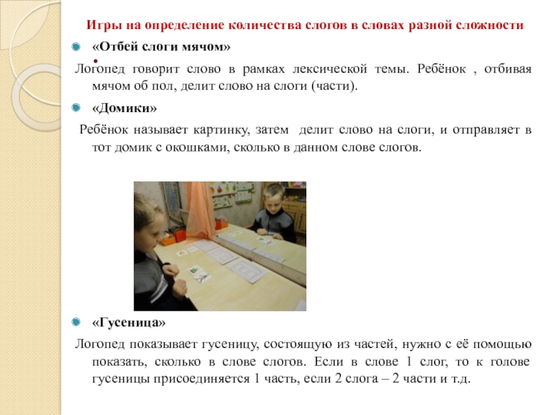 говорит слово в рамках лексической темы. Ребёнок , отбивая мячом об пол, делит слово на слоги (части).
