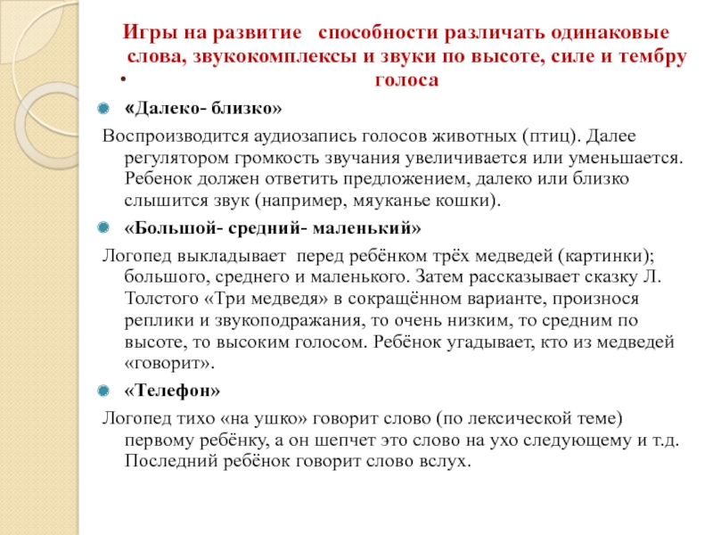 Игры на развитие способности различать одинаковые слова, звукокомплексы и звуки