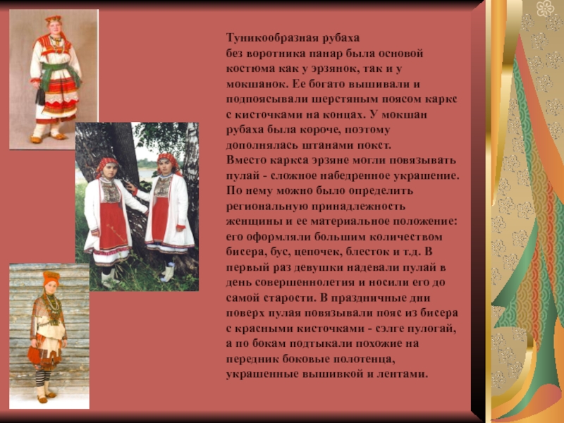 Туникообразная рубаха без воротника панар была основой костюма как у эрзянок, так и у мокшанок. Ее богато вышивали и подпоясывали
