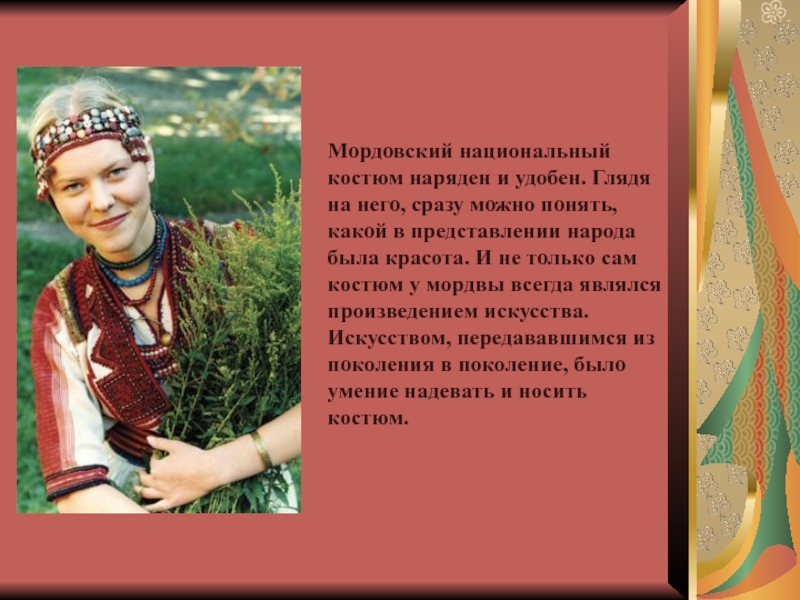 Слайд 2Мордовский национальный костюм наряден и удобен. Глядя на него, сразу можно понять,