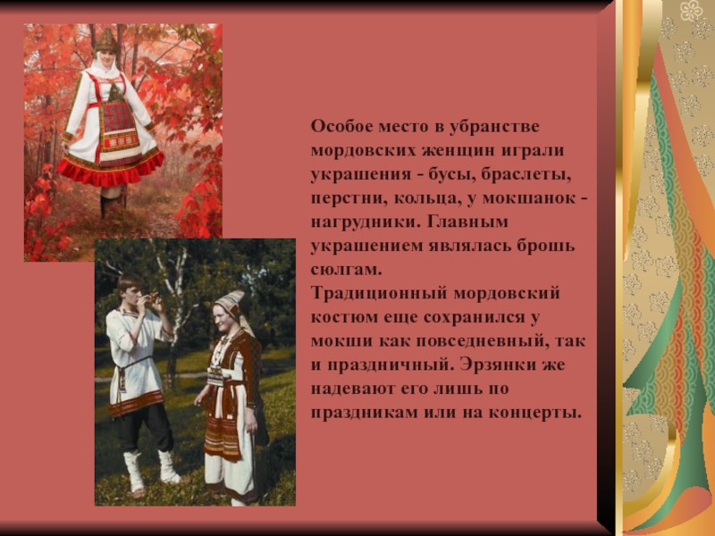перстни, кольца, у мокшанок - нагрудники. Главным украшением являлась брошь сюлгам. Традиционный мордовский костюм еще сохранился у мокши как повседневный, так и праздничный. Эрзянки же надевают его лишь по праздникам или на концерты.