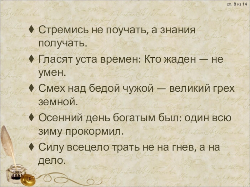 Это сайт презентаций, где можно хранить и обмениваться своими презентациями, докладами, проектами, шаблонами в формате PowerPoint с другими пользователями. Мы помогаем школьникам, студентам, учителям, преподавателям хранить и обмениваться учебными материалами.
