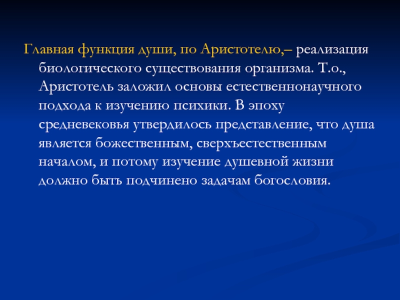 заложил основы естественнонаучного подхода к изучению психики. В эпоху средневековья утвердилось представление, что душа является божественным, сверхъестественным началом, и потому изучение душевной жизни должно быть подчинено задачам богословия.