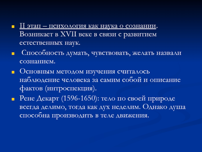 Слайд 9II этап – психология как наука о сознании. Возникает в XVII