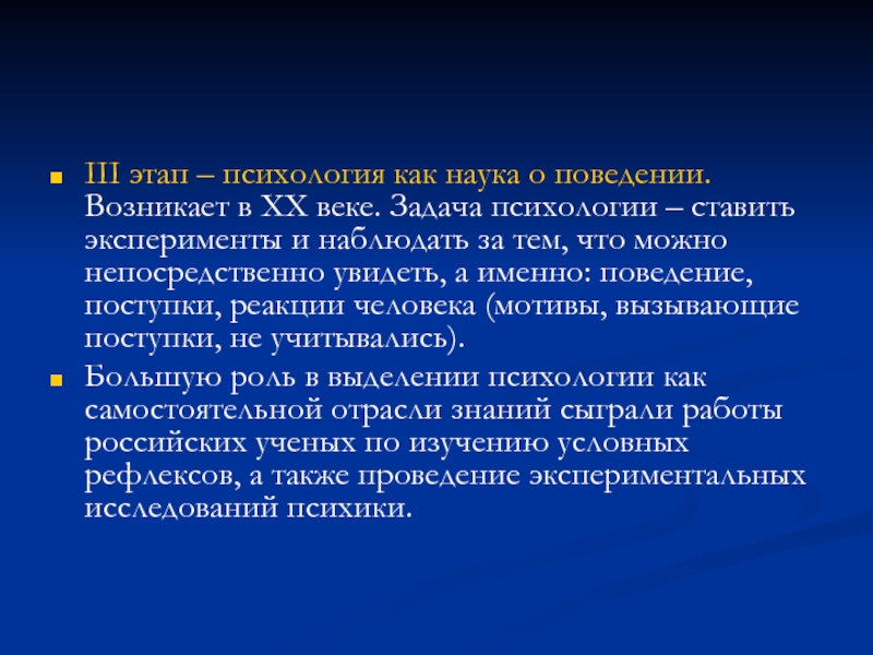 Большую роль в выделении психологии как самостоятельной отрасли знаний сыграли работы российских ученых по изучению условных рефлексов, а также проведение экспериментальных исследований психики.
