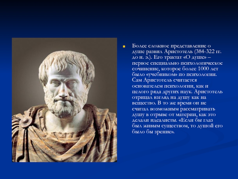 э.). Его трактат «О душе» – первое специально психологическое сочинение, которое более 1000 лет было «учебником» по психологии. Сам Аристотель считается основателем психологии, как и целого ряда других наук. Аристотель отрицал взгляд на душу как на вещество. В то же время он не считал возможным рассматривать душу в отрыве от материи, как это делали идеалисты. «Если бы глаз был живым существом, то душой его было бы зрение».