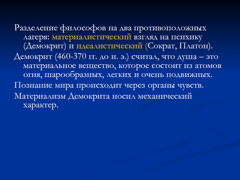 Слайд 3Разделение философов на два противоположных лагеря: материалистический взгляд на психику (Демокрит)