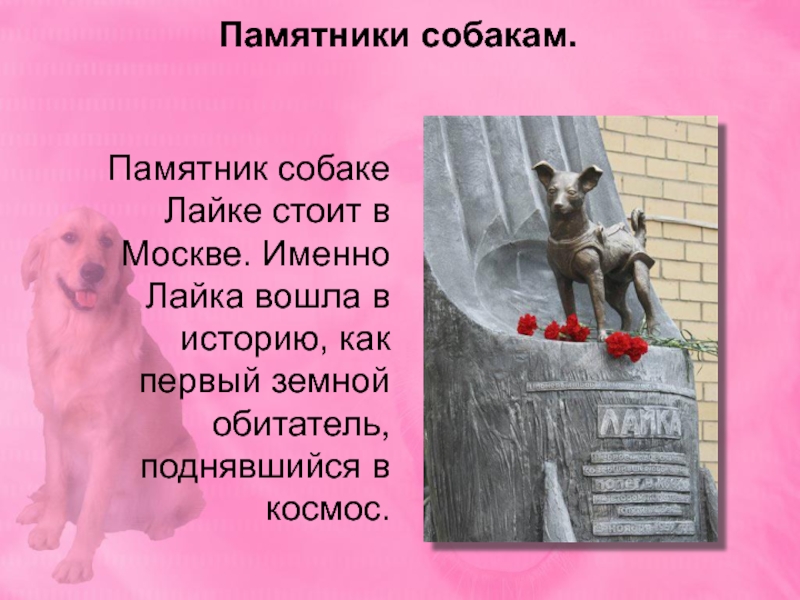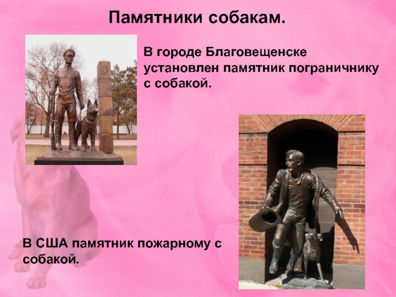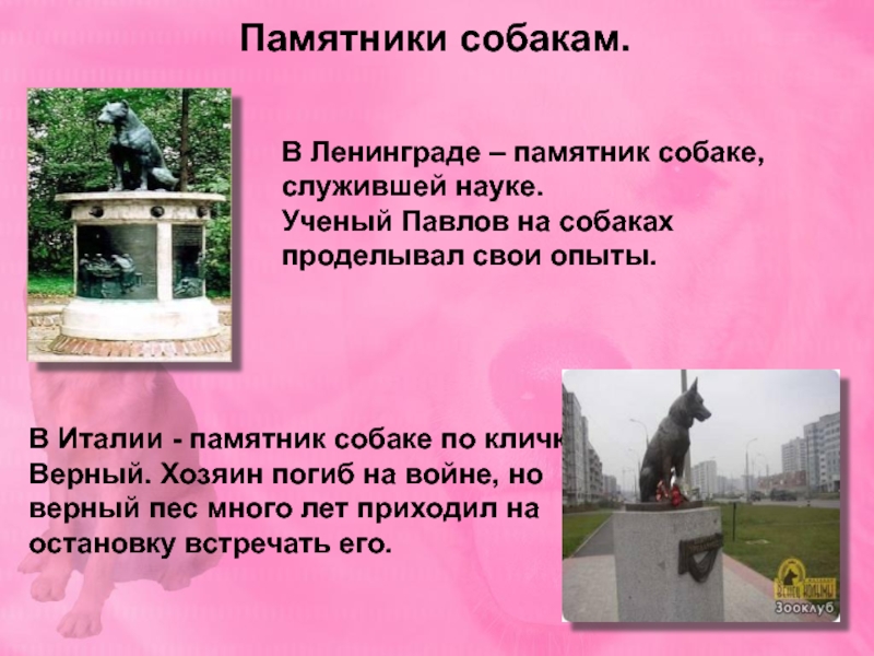 В Италии - памятник собаке по кличке Верный. Хозяин погиб на войне, но верный пес много лет приходил на остановку встречать его.
