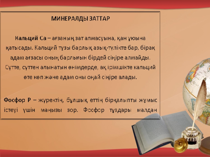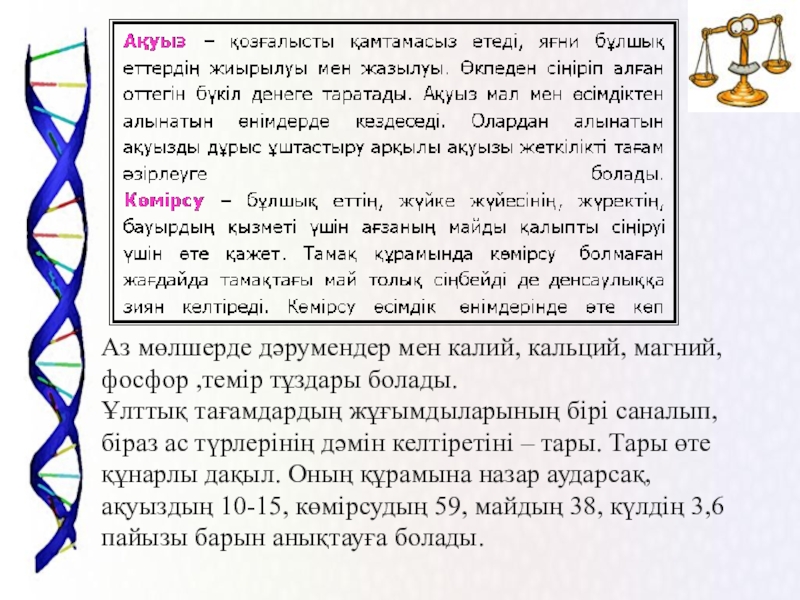 Слайд 24Аз мөлшерде дәрумендер мен калий, кальций, магний, фосфор ,темір тұздары болады.