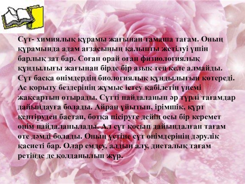 Слайд 17Сүт- химиялық құрамы жағынан тамаша тағам. Оның құрамында адам ағзасының қалыпты