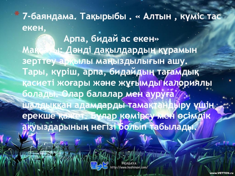 Мақсаты: Дәнді дақылдардың құрамын зерттеу арқылы маңыздылығын ашу.