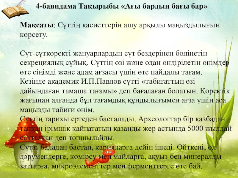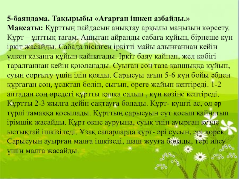 Слайд 195-баяндама. Тақырыбы «Ағарған ішкен азбайды.»
