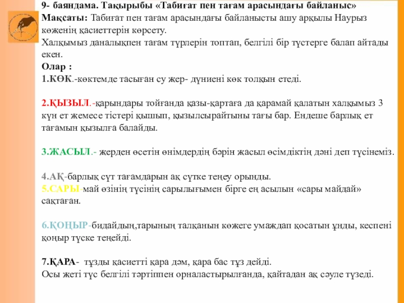Слайд 299- баяндама. Тақырыбы «Табиғат пен тағам арасындағы байланыс»