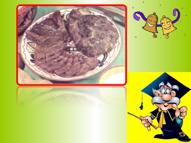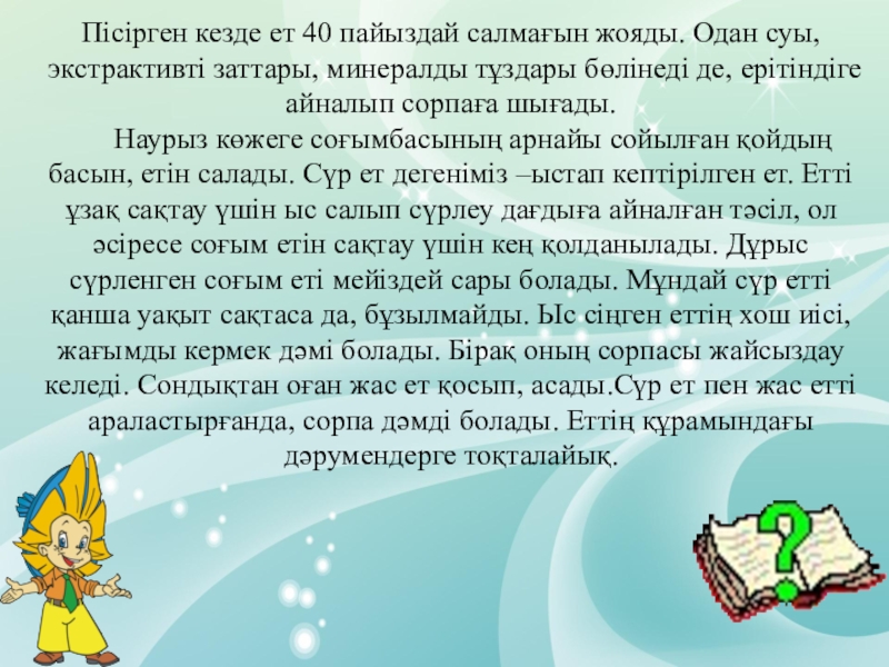 Слайд 10Пісірген кезде ет 40 пайыздай салмағын жояды. Одан суы, экстрактивті заттары,