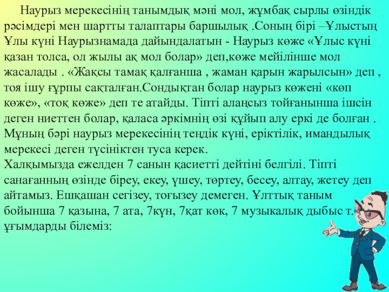 Слайд 3 Наурыз мерекесінің танымдық мәні мол, жұмбақ сырлы өзіндік