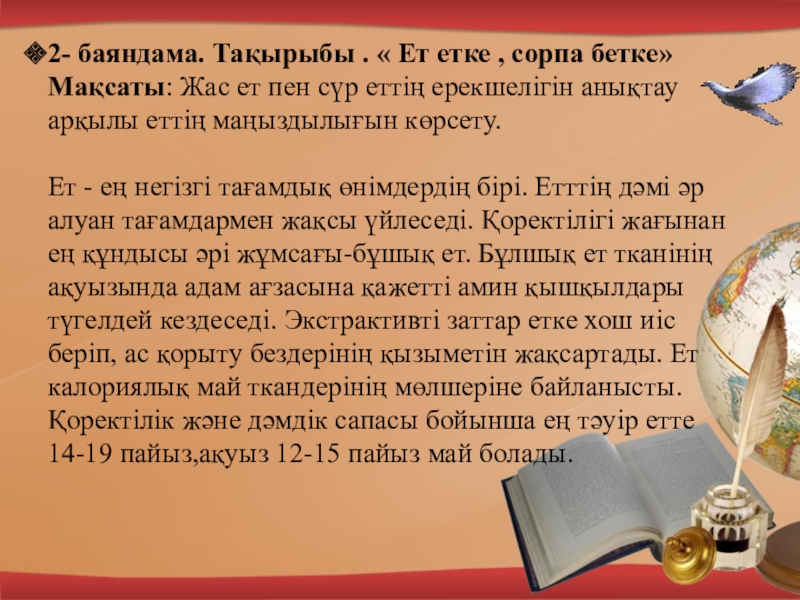 Слайд 82- баяндама. Тақырыбы . « Ет етке , сорпа бетке»