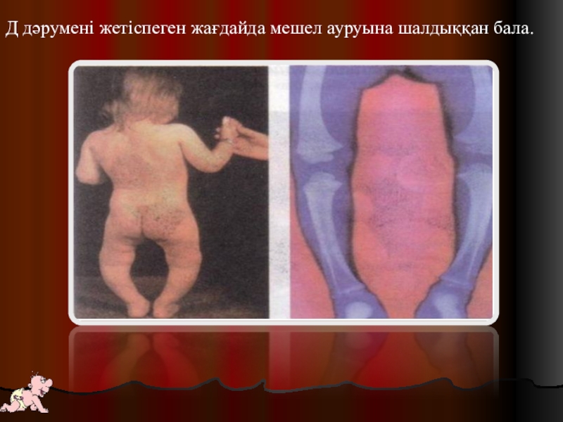 Слайд 22Д дәрумені жетіспеген жағдайда мешел ауруына шалдыққан бала.